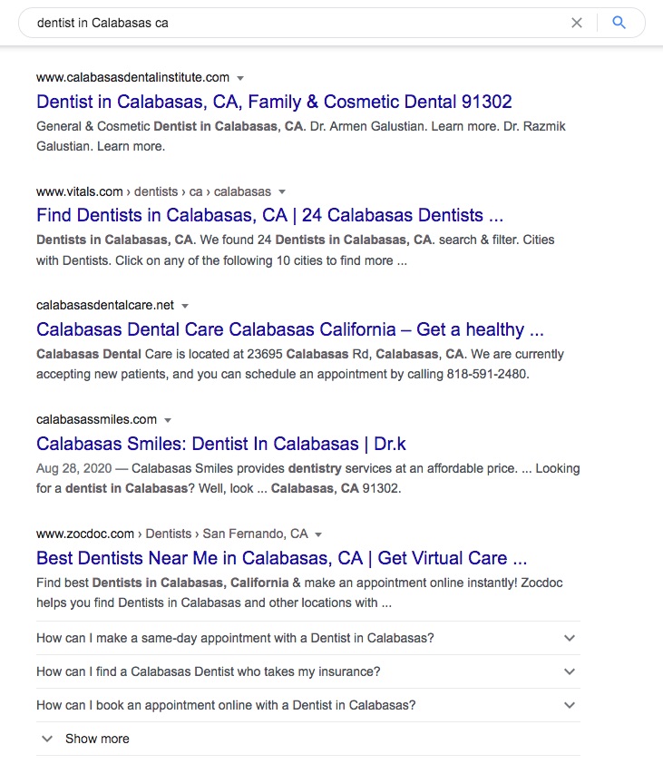 Snack packs are what you see right away when searching for a term on Google, right below the sponsored results (if there are any). This is a box containing the top three business listings pertaining to your search term. So, in this case, it’s “dentist in Calabasas ca.” This is usually the case when you search for any term about the product and service industry, and would greatly help your business gain more customers. Being a part of the snack pack would guarantee a higher chance of visibility.
