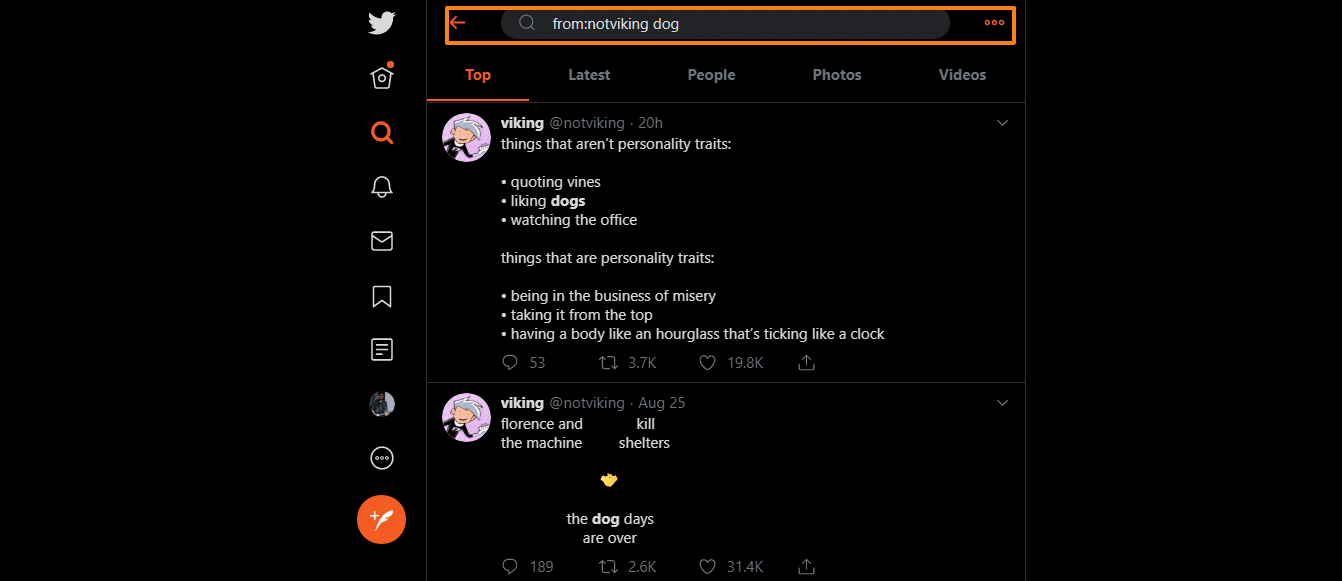 I usually run a Twitter search for specific accounts, especially when it’s a joke that I came across on Reddit. To do this, simply head over to the search tab, and type “from:username” to get all the tweets from that account. And if you need something more specific while only remembering a keyword, you can use the same search operator, with the “keyword/word” next to it. Here’s how it looks like (pardon my extremely dark Twitter theme):