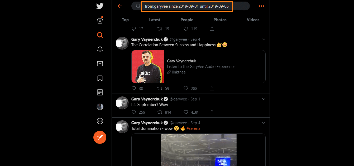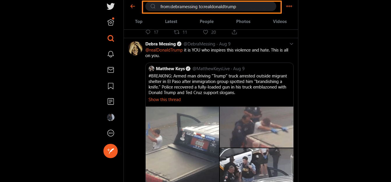 You can also do this with account-to-account interactions. If you want to find out about the latest tea from your favorite celebrities, you can use “from:username to:username” as your search operator: