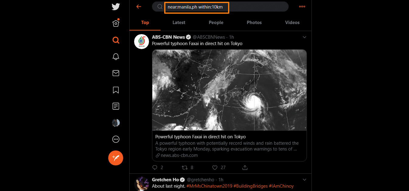 This next hack is ideal for news writers who collect tweets from a specific locale. This comes handy for getting reaction tweets from users of that particular area. The search operator “near:manila,ph within:10km” works wonders, I tell you.