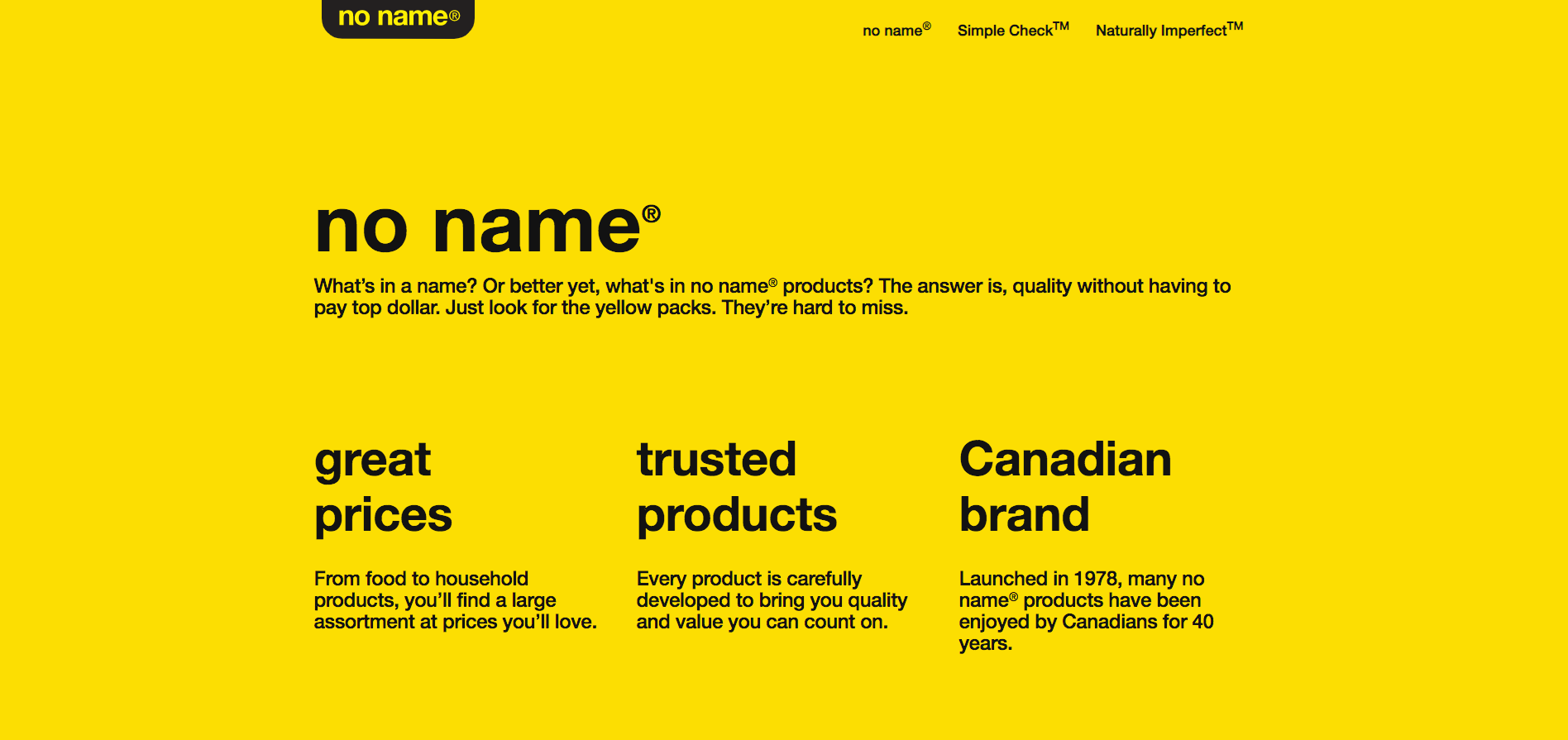 One of our favorite brands when it comes to minimalist typography aesthetics is Loblaw Companies’ “Noname” brand. Black and yellow. It’s as simple as that. They don’t have a flashy logo nor a striking mascot to identify their brand. All it takes is for you to see two colors and a Helvetica Neue Bold font (set to about 50% kerning) to identify them for who they are. Oddly enough, it sticks.